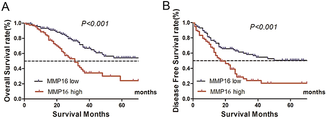 MMP16 mRNA levels were analyzed using a real-time PCR assay. Total RNA was isolated from tissue samples or cultured cells using TRIzol (Invitrogen), and reversely transcripted to cDNA with PrimeScript™ RT Master Mix (Perfect Real Time) kit (RR036A, Takara) based on the manufacturer’s instruction. Real-time PCR was performed with the SYBR Green master mix kit using an ABI-7900 thermal cycling instrument (Applied Biosystems). GAPDH gene was amplified as an endogenous control. Primers were as follows: GAPDH-F, 5’- GCA CCGTCAAGGCTGAGAAC-3’, GAPDH-R, 5’-TGGTG AAGACGCCAGTGGA-3’; MMP16-F, 5’- GGACAGAAA TGGCAGCACAAGC -3’, MMP16-R, 5’- CATCAAAGG CACGGCGAATAGC -3’.