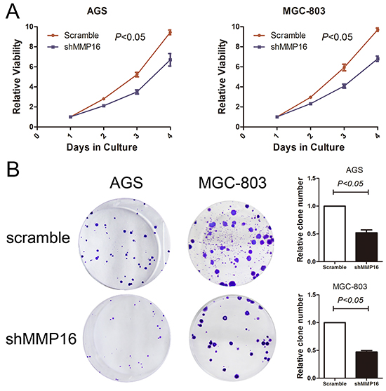 Biologically active short hairpin RNAs (ShRNA) were generated using the lentiviral expression vector pLKO.1-puro. The shRNA target sequence for human MMP16 was 5’- CGTGATGTGGATATAACCATT -3’. PLKO.1-scramble shRNA with limited homology with any known sequences in the human was used as a negative control. AGS and MGC-803 were transfected with the pLKO.1-shMMP16 expression vector or pLKO.1-scramble. The cells stably transfected were isolated using puromycin selection after the cells were transfected with expression vector or control plasmids.