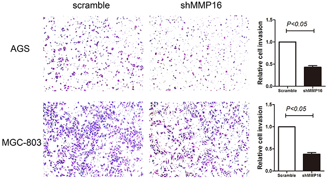 Figure 4: Transwell invasion ability in gastric cancer cells transfected with shMMP16 or scramble. Data are presented as the mean ± SD of 3 independent experiments. P <0.05 was considered statistically significant for the controls.