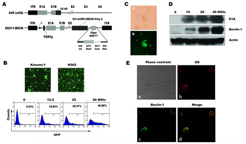 Figure 1: Schematic diagram of adenoviral constructs and CRAd infectivity in leukemic cells. (A) Compared to wild-type Ad5, SG511-BECN contains a human telomerase reverse transcriptase (hTERT) promoter-controlled E1 expression cassette in forward orientation, an E1B 55-kDa deletion, and Beclin-1 transgene in E3 region. The fiber was modified by an Ad5/11 chimeric fiber. (B) Kusumi-1 and K562 cells were infected with 50 MOI of SG511-GFP for 24 h and then observed under a fluorescence microscope (200×) (top panel). K562 cells were treated with the indicated amount of the virus for 24 h and then collected for analysis by FACS (bottom panel). (C) Bone marrow cells obtained from a patient with AML were infected with SG511-GFP at an MOI of 50, and then cultured for 5 days in colony culture assay. Photographs were viewed under a light microscope and fluorescence microscope, respectively (400×). (D) Beclin-1 and E1A expression was determined by Western blotting of K562 cells infected with SG511-BECN at the indicated concentrations for 48 h. Actin was Western blotted for equal loading. (E) Following SG511-BECN treatment for 48 h, Beclin-1 (green) and ER (red) in K562 cells were detected by confocal immunofluorescence microscopy. Representative data of three experiments is shown.