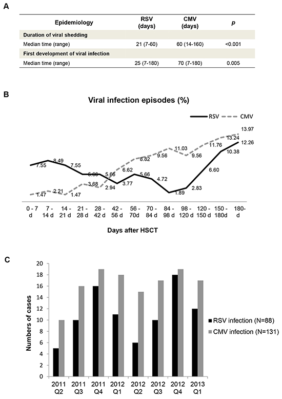 The CMV serology status of the recipients and donors was detected before HSCT. Positive for CMV-IgG and negative for CMV-IgM were confirmed for all of recipients and donors before HSCT. A total of 437 peripheral blood samples were collected and tested for CMV, a mean of 6.4 (4-14) samples per patient. A total of 68 patients had 131 episodes of CMV reactivation during the study period, with a mean of 1.9 (0-8) episodes per patient. A total of 437 oropharynx swabs were collected and tested for RSV, with a mean of 6.4 (3–15) per patient. The 68 patients had 88 episodes of RSV infection during the study period (mean 1.3 episodes, ranging from 0-5 episodes per patient).