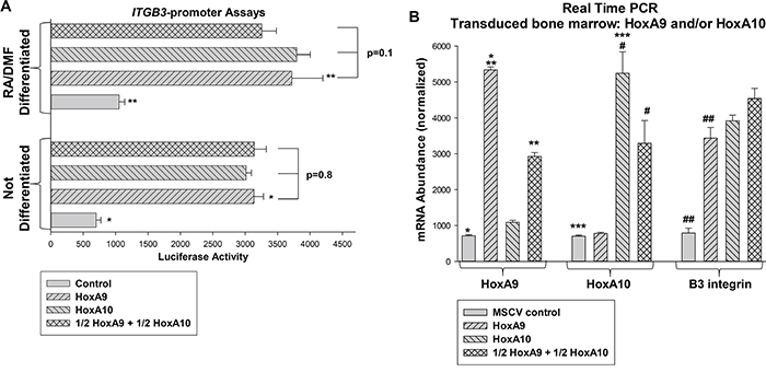 Figure 1: HoxA9 and HoxA10 cooperated to activate the ITGB3 promoter and increased expression of β3 integrin. A. HoxA9 and HoxA10 activated the same ITGB3 cis element. U937 cells were co-transfected with a minimal promoter/reporter construct with or without three copies of the HoxA10-binding ITGB3 cis element and vectors to overexpress HoxA9, HoxA10, HoxA9 + HoxA10 (total Hox vector constant) or empty vector. Reporter gene expression was determined with or without granulocyte differentiation with RA/DMF. Statistically significant differences (p<0.001, n=6) indicated by * or **. B. Overexpression of HoxA9 and HoxA10 increased expression of β3 integrin mRNA in myeloid progenitor cells. Murine bone marrow myeloid progenitor cells were transduced with a retroviral vector to express HoxA9, HoxA10, HoxA9 + HoxA10 (total Hox vector constant) or empty vector. Lin-CD34+ cells were analyzed by real time PCR as indicated. Statistically significant differences in mRNA expression (p<0.01, n=6) indicated by *, **, ***, #, or ##.