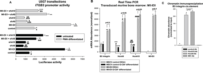 Figure 2: Mll-Ell increased ITGB3 promoter activity and β3 integrin expression in a HoxA9/HoxA10-dependent manner. A. Knockdown of HoxA9 or HoxA10 impaired ITGB3 cis element activation by Mll-Ell. Cells were co-transfected with a minimal promoter/reporter construct with three copies of the ITGB3 cis element (or control vector), vectors to express Mll-Ell (or control), and shRNAs specific to HoxA9 or HoxA10 (or scrambled controls). Reporter gene expression was determined with or without granulocyte differentiation with RA/DMF. Statistically significant differences (p<0.001, n=6) indicated by *, **, ***, #, ##, ###, &, &&, &&&, ^, ^^, or ^^^. B. Expression of Mll-Ell increased expression of β3 integrin in myeloid progenitor cells. Murine bone marrow myeloid progenitor cells were transduced with a retroviral vector to express Mll-Ell or empty control vector. Lin-CD34+ cells were analyzed by real time PCR as indicated. Statistically significant differences in mRNA expression (p<0.01, n=6) indicated by *, **, ***, #, ##, ###, or ^. C. HoxA9 and HoxA10 bound to the ITGB3 promoter, but Mll-Ell did not. U937 chromatin was co-immuno-precipitated with antibodies to HoxA9, HoxA10, Mll1 or irrelevant control antibody and amplified with primers flanking the ITGB3 cis element. Statistically significant difference (p<0.0001, n=3) indicated by *.