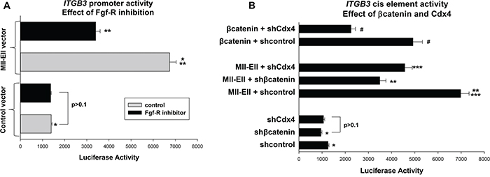 Figure 5: The Fgf-receptor influenced ITGB3 promoter activity in a βcatenin- and Cdx4-dependent manner. U937 cells were transfected with the ITGB3 cis element construct (or control vector) and analyzed for reporter activity. A. Fgf-receptor-inhibition decreased ITGB3 promoter activity in Mll-Ell-expressing cells. Cells were co-transfected with a vector to express Mll-Ell (or control vector) and reporter assays performed +/- PD173074. Statistically significant differences indicated by * or ** (p<0.0001, n=6). B. βcatenin increased ITGB3 cis element activity in a Cdx4-dependent manner, and Mll-Ell increased cis element activity in a βcatenin- and Cdx4-dependent manner. Cells were co-transfected with vector to express βcatenin or Mll-Ell (or vector control) plus an shRNA specific to Cdx4 or βcatenin (or scrambled control). Statistically significant differences (p<0.001, n=6) indicated by *, **, ***, or #.