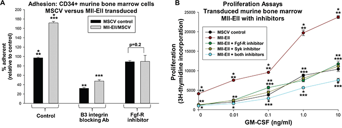Figure 6: Mll-Ell increased adhesion and proliferation of murine myeloid progenitor cells. Cells were transduced with a retroviral vector to express Mll-Ell or control vector. A. Mll-Ell increased β3 integrin-dependent adhesion of myeloid progenitor cells, but this was decreased by Fgf-R inhibition. Some cells were analyzed for % vitronectin adhesion after treatment with a β3 integrin blocking antibody or PD173074. Statistically significant differences (p<0.0001, n=6) indicated by *, ** or ***. B. Fgf-receptor inhibition cooperated with Syk inhibition to decrease cytokine hypersensitivity of Mll-Ell+ myeloid progenitor cells. Cells were stimulated with a dose titration of GM-CSF and proliferation assayed by 3H-thymidine incorporation. Cells treated with PD173074 (Fgf-R inhibitor), BAY-3606 (Syk inhibitor), both or neither were analyzed. Statistically significant differences (p<0.01, n=6) indicated by *, ** or *** for a given cytokine dose.