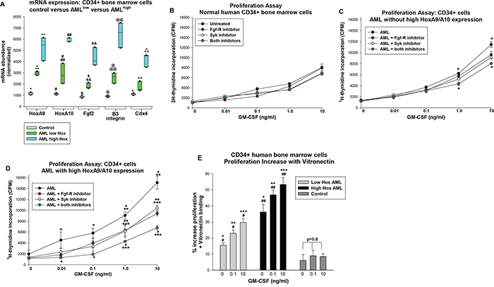 Figure 7: Expression of HoxA9 and HoxA10 in human AML cells correlated with sensitivity to inhibition of Fgf-receptor and/or Syk kinase. Lin-CD34+ bone marrow cells from human AML subjects or normal donors were compared. A. AML samples were grouped according to HoxA9 and HoxA10 expression. Gene expression was determined by real time PCR. Statistically significant differences (p<0.01, n=3 for control and n=6 for AML samples) indicated by *, **, #, ##, &, &&, @, @@, ^, or ^^. B. GM-CSF induced proliferation of control CD34+ cells was not influenced by inhibition of Fgf-receptor or Syk kinase. Control cells were analyzed for proliferation in response to a dose titration of GM-CSF in the presence of Fgf-receptor inhibitor, Syk inhibitor, both or neither. 3H-thymidine incorporation was not significantly different between the four groups at any cytokine dose (p>0.05, n=3) C. Combined treatment with Syk plus Fgf-receptor inhibitors decreased proliferation of low-Hox expressing AML at high GM-CSF doses. Cells from the low-Hox expressing AML group were analyzed as above. Statistically significant differences between untreated and Fgf-R-inhibitor + Syk-inhibitor treated cells (p<0.001, n=6) indicated by * for a given cytokine dose. D. GM-CSF induced proliferation of cells from the high-Hox expressing AML group was decreased by treatment with Fgf-receptor inhibitor or Syk inhibitor and further decreased with the combination. Cells from high-Hox expressing AML were analyzed as above. Statistically significant differences (p<0.001, n=6) between untreated versus Fgf-R-inhibitor + Syk-inhibitor treated indicated by *, untreated versus Fgf-R-inhibitor or Syk-inhibitor treated by **, and Fgf-R-inhibitor or Syk-inhibitor treated versus Fgf-R-inhibitor + Syk-inhibitor treated by *** for a given cytokine dose. E. GM-CSF induced proliferation of cells from the high-Hox expressing AML group was increased by vitronectin binding. Control, low-Hox and high-Hox expressing CD34+ cells were analyzed for proliferation as above with versus without vitronectin binding. Results were normalized for cell number. Statistically significant differences (p<0.02) between the groups is indicated by *, **, or ***and for different GM-CSF doses within a group by # or ##.