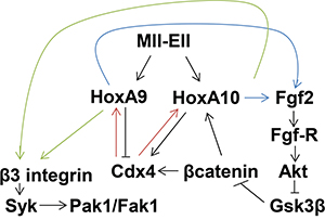 Our current studies identified an additional set of cross regulatory interactions for HoxA9, HoxA10 and the target genes FGF2 and ITGB3 (Figure 8). We found that Fgf-R-inhibition decreased αvβ3-dependent VN-adhesion and Syk activation. Further investigation determined that Fgf2/Fgf-R-signaling increased β3 integrin expression in Mll-Ell+ cells. Fgf2/Fgf-R-activation stabilizes βcatenin, increasing expression of βcatenin target genes, including CDX4 and HOXA10. The HOXA9 and HOXA10 promoters are activated by Cdx4, and we found Fgf-R inhibition was also associated with decreased HoxA9 and HoxA10 expression in Mll-Ell+ bone marrow progenitor cells. We additionally found βcatenin/Cdx4-dependent impairment of ITGB3 promoter activation in Fgf-R inhibitor treated, Mll-Ell+ cells.