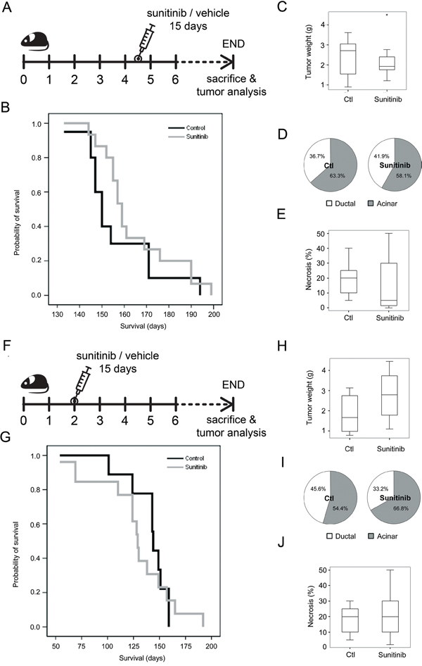 Figure 2: The effects of sunitinib administration on tumor progression and survival in the Ela-myc mice model. A. Ela-myc mice with well-established pancreatic tumors (4.5-months old) were treated daily with sunitinib (80 mg/kg; n = 20) or control vehicle (n = 20) for 15 days. Mice were sacrificed at endpoint based on ethical guidelines to study animal survival. B. A Kaplan-Meier survival plot showing no significant differences between control or sunitinib-treated animals. C. Box-and-whisker plot showing tumor weight at the moment of sacrifice. The asterisk present in the sunitinib treated group is not referring to significance but indicating an extreme outlier. D. Pie charts showing the percentage of ductal (white) and acinar (grey) areas in control or sunitinib-treated animal. E. Box-and-whisker plot showing tumor necrosis in acinar areas, as determined histopathologically. F. Sunitinib administration scheme in 2-month-old Ela-myc mice harboring incipient tumors. Similar to treatment of 4.5-month-old mice, no statistically significant differences were observed between treated and control mice regarding survival G., tumor weight H., tumor differentiation I. or necrosis J.