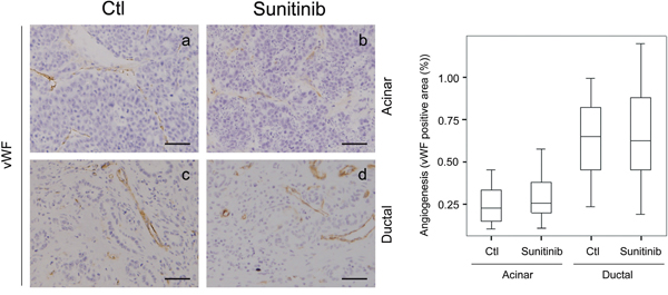 Figure 3: Sunitinib effects on Ela-myc pancreatic tumor angiogenesis. Tumor angiogenesis was evaluated for pancreatic tumors in control (Ctl) and sunitinib-treated Ela-myc mice by von Willebrand Factor (vWF) staining, in both acinar and ductal regions. Quantification of positive areas is shown on the right. Scale bars, 50 μm.