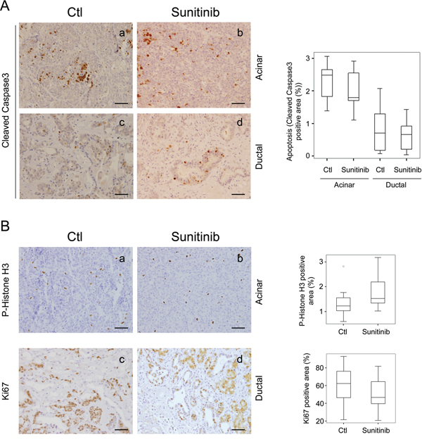 Figure 4: Sunitinib effects in Ela-myc pancreatic tumor cell apoptosis and proliferation. Tumor cell apoptosis and proliferation was analyzed for pancreatic tumors in control (Ctl) and sunitinib-treated Ela-myc mice. A. Tumor cell apoptosis was evaluated through cleaved caspase 3 (active form) staining. B. Tumor cell proliferation was evaluated through P-Histone H3 staining in acinar lesions, or Ki67 in ductal ones. Box-and-whisker plot quantifications are shown on the right (A, B). Scale bars, 50 μm.