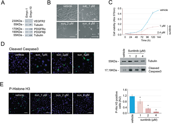 Figure 5: Cells derived from Ela-myc pancreatic tumors are sensitive to sunitinib in vitro. A. Analysis by Western blot of the expresssion of the sunitinib-targeted receptors VEGFR2, PDGFR-α and PDGFR–β in two different cell lines derived from Ela-myc pancreatic tumors. B. Bright field images showing Emyc-1 cell sensitivity to different doses of sunitinib (1, 2 or 4 μM) in vitro, as compared to cells treated with vehicle (DMSO). Scale bars, 100 μm. C. MTT experiments were performed to quantify cell viability upon sunitinib treatment (1, 2 or 4 μM) in the Emyc-1 cell line, observing a dose-dependent effect. D. Left, immunofluorescence of cleaved caspase 3, to detect cell apoptosis upon sunitinib treatment (1, 2 or 4 μM). Scale bars, 20 μm. Right, Western blot analysis of the levels of cleaved caspase 3 in Emyc-1 cell line treated with sunitinib. Tubulin levels are shown as the loading control. E. Left, Immunofluorescence of P-Histone H3, to show cell growth arrest upon sunitinib treatment (1, 2 or 4 μM) in Emyc-1 cells. Scale bars, 50 μm. Right, Bar plots showing quantification of P-Histone H3 immunofluorescence experiments on the right. *p < 0.05 (Student’s t-test).