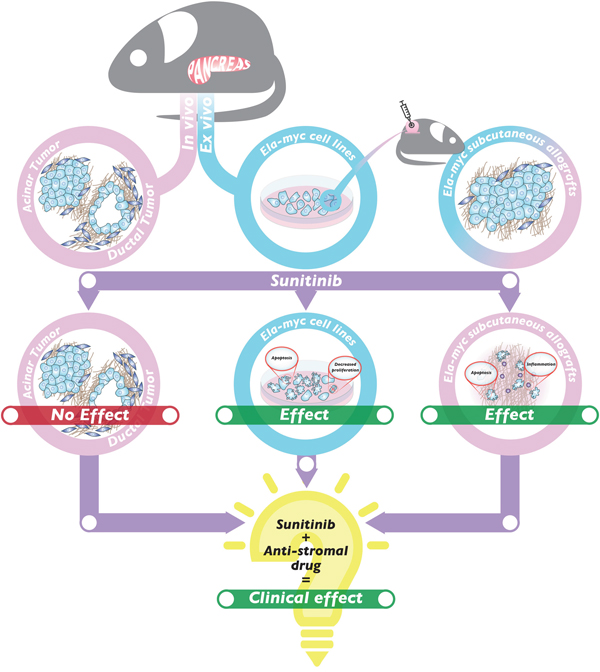 Figure 7: Working model of the in vivo and in vitro effects of sunitinib in the Ela-myc mouse model. Sunitinib treatment of Ela-myc pancreatic acinar and ductal tumors does not show any significant effect in vivo (left). In contrast, Ela-myc–derived tumor cell lines are highly sensitive to sunitinib in vitro, with increased apoptosis and decreased proliferation (center). Importantly, subcutaneous injection of these cells in SCID Beige mice forms tumors that are highly sensitive to sunitinib treatment (right). These data may help understand sunitinib failure for PDA patients and suggest that a combination of sunitinib and an anti-stromal drug may be a promising strategy for successfully treating this pathology in the clinics.