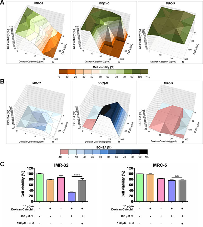 Figure 4: Copper potentiated Dextran-Catechin activity in neuroblastoma cells. (A) Surface plots illustrating cell viability after combination treatment with Dextran-Catechin and CuCl2 for 48 h in IMR-32, BE-2(C) and MRC-5 cells. (B) Surface plots of the Excess Over Highest Single Agent (EOHSA) show the difference in cell viability inhibition between Dextran-Catechin and CuCl2 and the most potent single agent at corresponding dose in IMR-32, BE(2)-C and MRC-5 cells. Shades of blue colour-code positive values and thus represent greater effect of the combination treatment compared to single agents. (C) Viability of IMR-32 and MRC-5 cells after single or combination treatment with Dextran-Catechin and CuCl2 , and/or depletion of copper by addition of the chelation agent tetraethylenepentamine (TEPA). Columns, means of at least three individual experiments; Bars, SEM (****p < 0.0001).