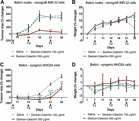 Figure 6: Dextran-Catechin showed significant anticancer activity in neuroblastoma mouse models. (A) Nude mice (BALB/c) injected subcutaneously with human IMR-32 cells were treated with 150 or 300 μg/ml Dextran-Catechin when the mean tumour volume reached about 200 mm3. Treatment administered i.v. weekly for three weeks significantly reduced tumour growth in mice treated with 300 μg/ml Dextran-Catechin compared to the saline control cohort. (B) Weight of tumour bearing nude (BALB/c) mice for the saline control and Dextran-Catechin treated groups showed no significant difference. (C) Syngeneic neuroblastoma model using immuno-competent mice (BALB/c) injected subcutaneously with murine neuroblastoma NHO2A cells and treated with 150 or 300 μg/ml Dextran-Catechin when the mean tumour volume reached about 200 mm3. Treatment administered i.v. weekly for three weeks significantly reduced tumour growth in Dextran-Catechin treated mice compared to the saline control. (D) Change in (BALB/c) mouse weights for the saline control and Dextran-Catechin treated groups in the syngeneic neuroblastoma model showed no significant differences. Columns, means of at least three individual experiments; Bars, SEM (*p < 0.05, **p < 0.01, ***p < 0.001, ****p < 0.0001).
