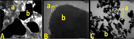 Figure 2: Scanning electron microscopy image of the new tracer, ICG (a) combined with the Rituximab (b). (A) is the combination ratios of 1:3, (B) is the combination ratios of 1:4, and (C) is the combination ratios of 1:12, 1:16, and 1:32. There are many uncombined ICG found in A and sediments observed in C.