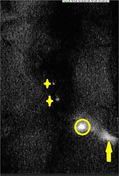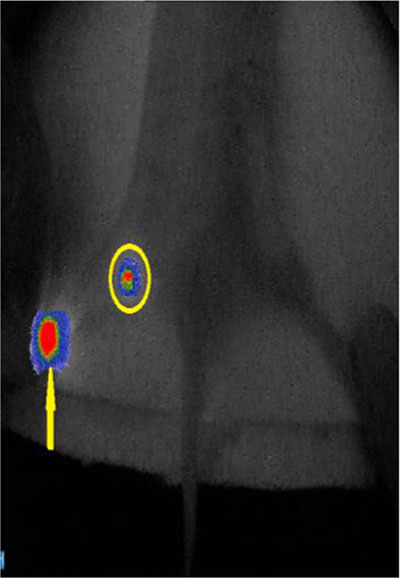 Figure 5: The fusion image of the near-infrared fluorescence and the cyclone storage phosphor system. The location of SLN detected by the new tracer was consisted with the location of SLN detected by the radiotracer. (circle is SLN; yellow arrow is injection point).