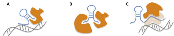 Figure 1: Main mechanisms of action of lncRNAs. Adapted from Rinn et al. [16]. A. LncRNAs can guide proteins to DNA sequences, such as chromatin remodeling proteins. B. LncRNAs can act as scaffolds to induce the formation of functional protein complexes. C. LncRNAs can mimic DNA structures and act as decoys for proteins with DNA binding activity.