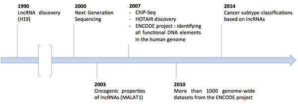 These data underscore the dramatic importance of lncRNAs in cancer. Interactions between lncRNAs and major oncogenic pathways support the role of lncRNAs in early steps of cancer development and their interest for more accurate cancer classifications. In addition, the unveiling of novel crosstalks between lncRNA and micro-RNAs raises the importance of epigenetic regulations in cancer, an expanding field of study.