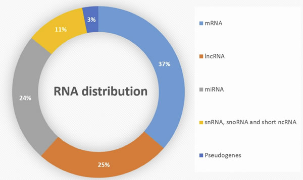 Figure 3: Distribution of RNA subtypes in human genome. Adapted from Atianand et al. [60]. lncRNAs: long non-coding RNAs, miRNAs: micro RNAs, short ncRNAs: short non-coding RNAs, snRNAs: small nuclear RNAs, snoRNAs: small nucleolar RNAs.
