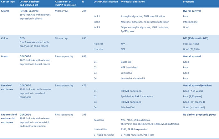 These studies suggest that lncRNA expression profile is correlated with genomic, genetic, pathological and clinical features of diverse neoplasms, but also brings independent prognostic value in various subsets of tumors. As such, lncRNAs are likely to be integrated in cancer classifications during the next decades.