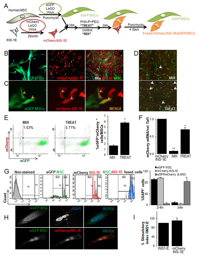 Figure 1: Generation of rat-human β-MSC heterokaryons. (A) Schematic illustration of the strategy for generation of human stable eGFP+MSCs and rat mCherry+INS-1E cells that carry antibiotic-selectable markers. Cells were mixed (“MIX”) or fusion was induced by treatment with 100 µg/ml PHA-P and 50%W/V PEG (“TREAT”). Interspecies heterokaryons and human MSCs were selected by puromycin for 4 days. (B) Cultured eGFP+MSCs (left; 200X), mCherry+INS-1E (middle; 200X) and MIX (right: 100X) and (C) mCherry+INS-1E, eGFP+MSC and double positive β-MSC (orange arrows) in TREAT condition (400X). (D-H) TREAT cells after puromycin selection. (D) MIX (control) and TREAT conditions after 4 days puromycin selection, white arrows show eGFP+mCherry+ cells (40X). (E) Analysis and quantification (right) of mCherry+eGFP+ cells in MIX and TREAT conditions by FACS analysis. Gating was set up with single mCherry or single eGFP+ cells and conditions kept constant. (F) The relative mCherry mRNA expression normalized to INS-1E cells. RT-PCR was normalized to rat Taf1 (G) Polyploidy analysis by FACS of eGFP+MSCs, mCherry+INS-1E (controls) and eGFP+mCherry+ heterokaryons. Gating was set for control non-stained cells and kept constant. (H) An eGFP+ polyploid cell (upper panel) und an mCherry+eGFP+ polyploid heterokaryon from the eGFP+MSCs- mCherry+INS-1E fusion by CLSM (400X). (I) Insulin secretion of mCherry INS1-E in compare to INS-1E cells by glucose stimulation. All analyses were performed in at least three independent experiments from three MSC donors and show mean ± SEM. *P< 0.05 Treat compared to Mix. ** Mix compared to mCherry INS-1E alone. +P< 0.05 eGFP+mCherry+β-MSC compared to eGFP+MSC or to mCherry+INS-1E.