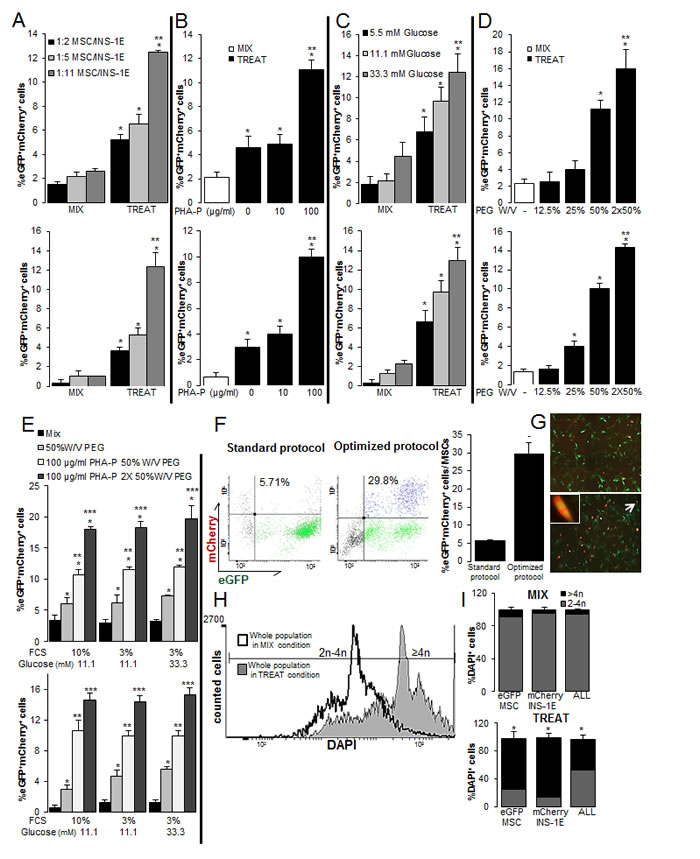 Figure 2: Optimization of the PEG-mediated cell fusion for rat-human β-MSC heterokaryons. (A-E) The percentages of MSC/INS-1E cells measured by eGFP+mCherry+ flow cytometry (top) as well as quantitative fluorescent microscopic analysis (bottom) in MIX and TREAT conditions after puromycin selection of all cells in culture. (A) The mixture of the 1:2 ratio of MSC/INS-1E cells (standard protocol), 1:5 or 1:11 in mixed cells (MIX) and 50%W/V PEG and 100 μg/ml PHA-P treated cells at 11.1 mM glucose as the control glucose concentration for INS-1E cells. (B-E) MSC/INS-1E cells at a ratio of 1:11. (B) 50%W/V PEG treated cells were exposed to 0, 10 and 100 μg/ml PHA-P. (C) 50%W/V PEG and 100 μg/ml PHA-P treated and untreated mixed cells were pre-incubated for 8 h with 5.5, 11.1 or 33.3 mM glucose. (D) 100 μg/ml PHA-P treated were exposed to 12.5, 25 and 50% W/V or twice 50% W/V PEG. (E) 1X or 2X 50%W/V PEG and 100 μg/ml PHA-P treated cells and mixed cells were pre-incubated with media including 10% FCS, 3% FCS or 3% FCS/ 33.3 mM glucose. (F, G) Comparison of the number of eGFP+mCherry+ MSCs to all MSCs between standard and optimized protocol (1:11 MSC/INS-1E; 2X50%W/V PEG and 100 μg/ml PHA-P) by flow cytometry analysis of mCherry and eGFP (F) and by fluorescence microscopy (G; 40X; right). Arrow bar shows an eGFP+mCherry+ MSC in higher magnification (400X). The difference in A-E and F is in the normalization strategy; while results in A-E are normalized to all cells in culture, in F they were normalized to all MSCs. (H, I) Polyploidy analysis by FACS before puromycin selection of mixed and treated cells (H) and quantification of polyploid cells within eGFP+MSCs or mCherry+INS-1E cells alone and the whole population (eGFP+MSCs/mCherry+INS-1E/eGFP+mCherry+β-MSC) (I). Average counted cells were 5000 events per condition. Analyses were performed in at least three independent experiments and show mean ± SEM. *P< 0.05 Treat compared to Mix at the same conditions; **P< 0.05 at the ratio of 1:11 compared to 1:5 (A), 100 compared to 10 μg/ml PHA-P (B), 33.3 compared to 5.5 mM glucose (C), 2X compared to 1X 50% W/V PEG (D), PHA-P/PEG compared to PEG alone, ***P<0.05 2x compared to 1x 50% W/V PEG at the same conditions, -P< 0.05 optimized compared to standard protocol;