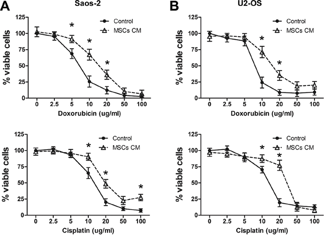 Human MSCs harvested from the bone marrow were characterized by both surface marker stainings and functional studies (Supplemental Figure S1A, S1B). We then investigated whether MSCs also protect osteosarcoma cells from drug-induced apoptosis. Our study focused on doxorubicin and cisplatin, which are two of the most commonly used drugs for osteosarcoma chemotherapy [20]. Saos-2 and U2-OS osteosarcoma cells were exposed to different concentrations of chemotherapy drugs in the presence or absence of MSCs CM containing 1% FBS for 24 h. Saos-2 cells that were grown in MSCs CM and treated with 10 or 20 μg/ml doxorubicin or cisplatin (concentrations ranging from 0 to 100 μg/ml) showed a significant increase in survival compared with cells cultured in regular medium (control; Figure 1A). Similarly, U2-OS cells treated with 10 or 20 μg/ml doxorubicin or cisplatin displayed significantly greater survival when cultured in the presence of MSCs CM compared to regular medium (Figure 1B).