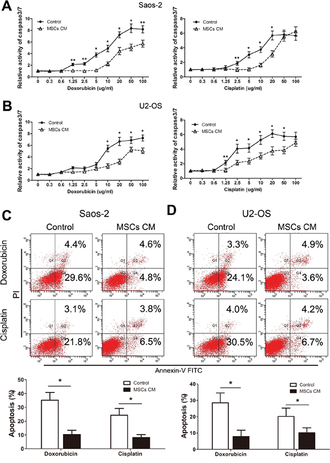 Figure 2: MSCs protect osteosarcoma cells from drug-induced apoptosis. A. Saos-2 cells (1×104) that were cultured in the presence or absence of 1% serum MSCs CM and treated with doxorubicin (left) or cisplatin (right) at indicated concentrations for 48 hours were examined for caspase 3/7 activity. The data represent the mean±SD fold change from Saos-2 cells cultured in DMEM (Control) in triplicate wells. B. U2-OS cells (1×104) were cultured and treated as Saos-2 were examined for caspase-3/7 activity. C. Saos-2 cells that were cultured in the presence or absence of 1% serum MSCs CM and treated with doxorubicin or cisplatin (20 μg/ml) for 48 hours were examined for Annexin V binding using FACS analysis. Top, representative analysis by FACS at 48 hours. Bottom, data represent the mean±SD of Annexin V–FITC positive cells of three independent experiments. D. U2-OS cells (1×104) were cultured and treated as described for Saos-2 cells, and FACs analysis was used to assess the percentage of apoptotic cells. n=3; *, p<0.01; ** p<0.05.