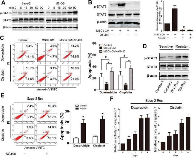 Figure 3: STAT3 is essential for MSC- and drug-induced osteosarcoma chemoresistance. A. Saos-2 and U2-OS cells were treated with MSCs CM for the indicated times, and p-STAT3 and STAT3 levels were examined by Western Blot. B. Saos-2 cells were cultured in the presence or absence of MSCs CM and treated with AG490 for 30 min. Left, p-STAT3 and STAT3 levels were examined by Western Blot. Right, the data represent the means ± SD fold change from Saos-2 cells cultured in DMEM (Control) in three independent experiments. C. Saos-2 cells were cultured in MSCs CM in the presence or absence of AG490 for 48 hours. Left, Annexin V binding was tested by FACS. Right, data represent the mean ± SD of apoptotic cells of three independent experiments. D. Chemoresistant Saos-2 cells were obtained from low dose exposures to (1 μg/ml) doxorubicin or cisplatin treatment. p-STAT3 and STAT3 levels were assessed by Western blot. E. Chemoresistant Saos-2 cells were exposed to corresponding drugs (20 μg/ml) for 48 hours. Left, Annexin V binding was tested by FACS. Right, data represent the mean±SD of apoptosis cells of three independent experiments. F. Chemoresistant Saos-2 cells that were treated with AG490 were exposed to corresponding drugs (20 μg/ml) for 4 days. Caspase 3/7 activity was tested at the indicated times. n=3; *, p<0.01; #, p>0.05.