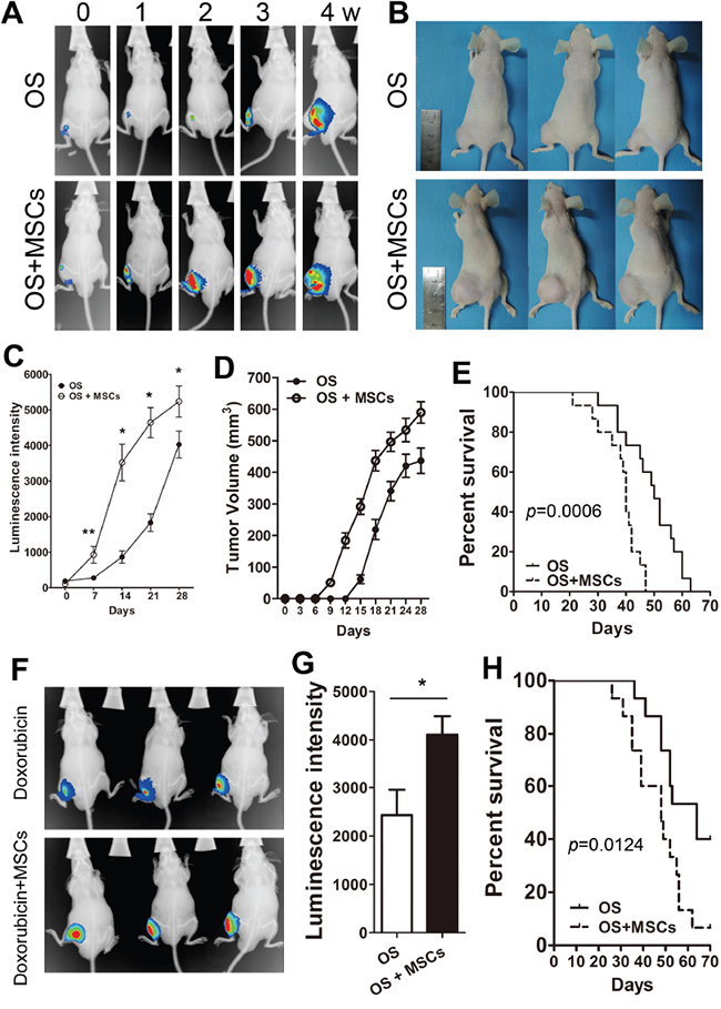 We then asked whether exogenous MSCs promote the proliferation and survival of tumors in vivo. Using a osteosarcoma mouse model with co-injection of MSCs with Saos-2, the bioluminescence imaging revealed that MSCs significantly enhanced the signal at the tumor site during the 4-week period (Figure 4A, 4C). Moreover, the tumor volume of the Saos-2 group that was injected with MSCs was larger than the control group (Saos-2, Figure 4B, 4D). In addition, co-injection with MSCs and Saos-2 cells significantly decreased the survival time of mice (Figure 4E). To evaluate the effectiveness of MSCs on chemotherapy, the mice were inoculated with Saos-2 or Saos-2/MSCs and treated with doxorubicin (10 mg/kg by weekly intraperitoneal injection (ip)). Only weak bioluminescence signals were observed in the Saos-2 group, while mice co-injected with MSCs had a stronger signal at week 4 (Figure 4F, 4G). Compared with the Saos-2 OS group, co-injection with MSCs significantly reduced the survival of the mice (Figure 4H).