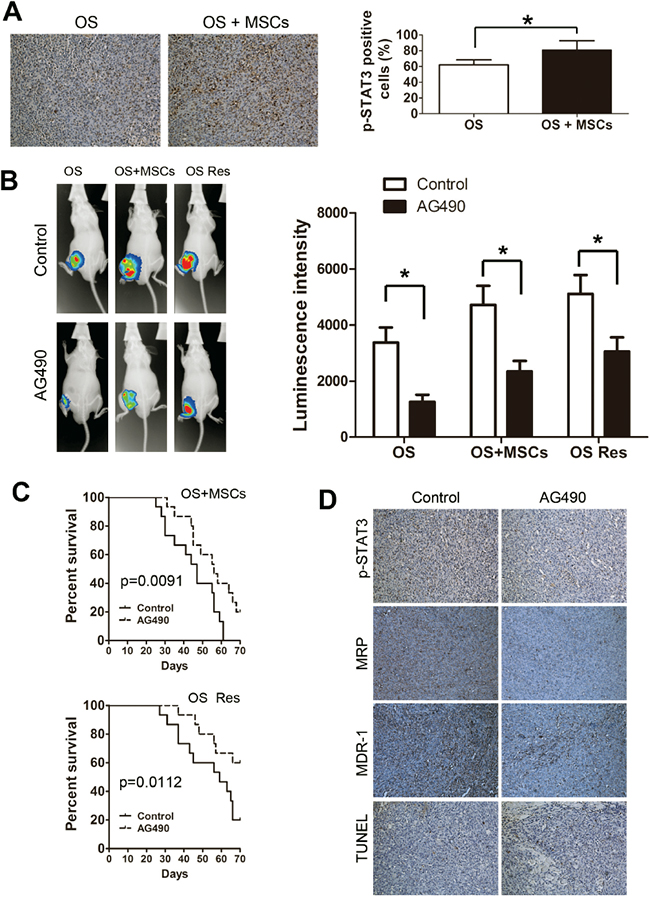 We next asked whether STAT3 signaling modulates chemotherapy effectiveness in vivo. The OS and OS+MSCs mice were sacrificed, and the STAT3 activation levels were detected by IHC. We observed that co-injection of tumor cells with MSCs dramatically increased the p-STAT3 levels in the tumor (Figure 5A). Then, mice were injected withSaos-2, Saos-2+MSCs or drug resistant Saos-2 cells (Saos-2 Res group) and treated weekly with doxorubicin and 500 μg AG490 (or DMSO in the control) via intraperitoneal injection for 4 weeks. While a strong signal was observed at the tumor sites in all three groups, injection with AG490 significantly decreased the bioluminescence intensity in these groups (Figure 5B). In addition, AG490 treatment in both Saos-2+MSCs and Saos-2 Res groups lengthened the survival times of the mice (Figure 5C). STAT3 activation increase expression of downstream pro-chemoresistant genes. Therefore we also evaluated the protein levels of MRP and MDR-1, which are known to promote chemotherapy resistance in tumors. The immunohistochemistry results showed that AG490 treatment decreased the activation of STAT3 and the expression of MRP and MDR-1. The TUNEL assay indicated an increase in cell apoptosis following the injection of AG490 (Figure 5D).