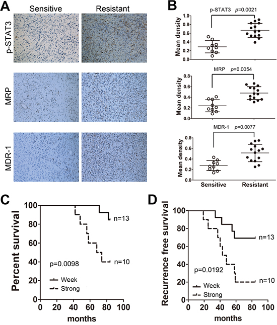 To confirm a clinical role for STAT3 in osteosarcoma chemoresistance, tumors were collected during surgical resection from patients that were treated with systemic chemotherapy (9 sensitive and 14 resistant to chemotherapy, Supplementary Table S1). We observed that p-STAT3, MRP and MDR-1 expression levels were much higher in resistant tumors than sensitive samples (Figure 6A, 6B). Patients were divided according to the density of the p-STAT3 staining (more or less than 0.5) into weak (n=10) or strong groups (n=13). One sample from the resistant group showed a staining score less than 0.5. The survival analysis indicated that the outcome for patients in the p-STAT3 strong-staining group was significantly worse than the p-STAT3 weak-staining group (Figure 6C). In addition, the p-STAT3 weak-staining group showed a longer recurrence-free time after combined chemotherapy treatment and surgical resection (Figure 6D).
