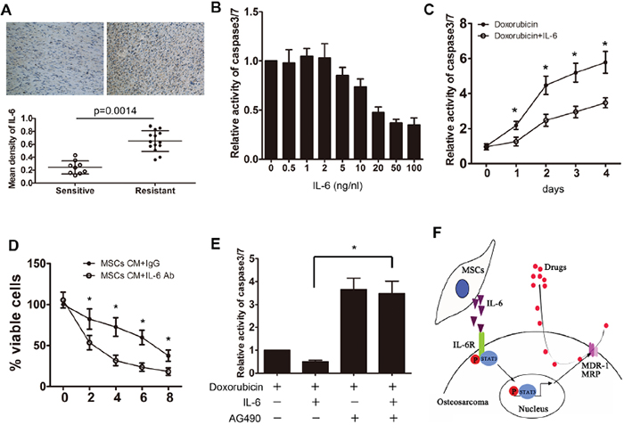 Figure 7: MSC-induced resistance is mediated by the release of IL-6. A. Chemotherapy sensitive and resistant osteosarcoma samples were collected, and the mean density of IL-6 was detected by immunohistochemistry. B. Saos-2 cells were exposed to 20 μg/ml doxorubicin and then treated with different concentrations of IL-6 for 48 h. The relative caspase 3/7 activity in the tumor cells was examined. C. Saos-2 cells were exposed to 20 μg/ml doxorubicin and then treated with 20 ng/ml of IL-6 for 4 days. The relative caspase 3/7 activity was examined daily. D. Saos-2 cells were cultured in the presence or absence of MSCs CM and then treated with IL-6 neutralizing antibody. The number of viable cells was then assessed using the CCK-8 assay. E. Saos-2 cells were exposed to 20 μg/ml doxorubicin and then treated with IL-6 and/or AG490. The caspase 3/7 activity was tested. F. Graphical depiction of the hypothetical pathway governing MSC-induced osteosarcoma resistance. Activation by IL-6 from MSCs may regulate drug resistance by modulating the expression of multiple drug resistant genes in osteosarcoma cells. n=3; *, p<0.01.