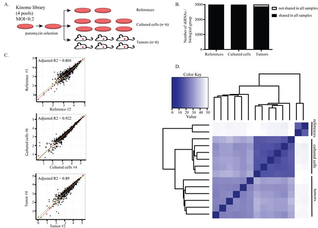 Before hit calling, we performed several quality control analyses to confirm that the data generated from the screens was sufficiently robust for negative selection analyses. First, quantification of the shRNAs present in tumors and in in vitro samples showed that the complexity of the library was maintained throughout the experiment, as we could detect approximately 3000 unique shRNAs in the references, cultured cells and tumor samples. Importantly, the majority of these shRNAs were shared amongst all sample groups. Specifically, 85% were shared between the cultured cells and tumors. These findings indicate that the complexity of the library was well maintained; this allowed the identification of shRNAs that were lost due to functional selection of a specific shRNA rather than random selection of shRNAs as a result of sampling due to clonal expansion (Figure 1B, Supplementary Figure 1A).