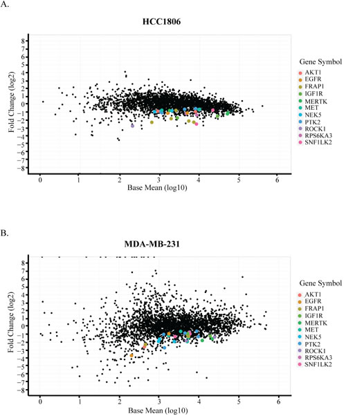 Figure 2: Identification of in vivo-specific targets. Comparison of tumors to cultured cells by DESeq analysis in A. HCC1806 and B. MDA-MB-231 cells. X-axis shows the average abundance of each shRNA across all samples on log10 scale. Y-axis shows the fold change of each hairpin in tumors compared to the cultured cells in log2 scale. Common hits identified based on the criteria are color-coded.