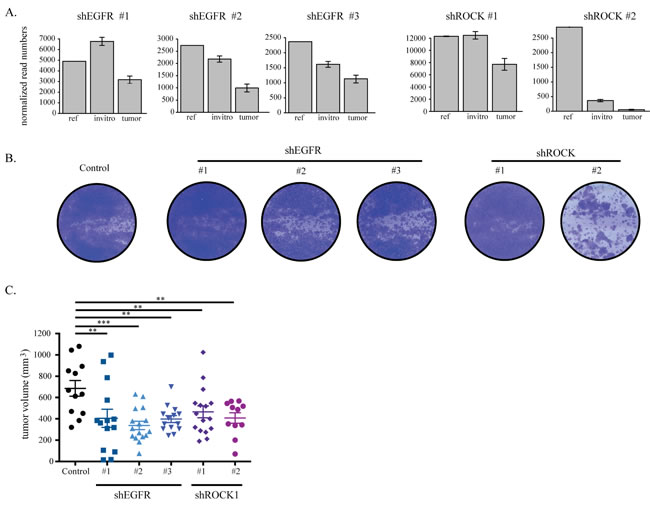 Figure 3: EGFR and ROCK1 depletion impairs TNBC growth. A. shRNA read counts of the hairpins in the reference, cultured cells (invitro) and tumor samples as found in the HCC1806 screen. B. HCC1806 cells were transduced with lentiviral constructs against EGFR and ROCK that were identified as hits in the screen. After puromycin selection, 0.3*105 cells were seeded on 6-well plates. Cells were stained with crystal violet after six days. C. HCC1806 cells transduced with lentiviral constructs against luciferase, EGFR and ROCK were orthotopically injected into the 4th mammary fad pad of NSG mice. Tumors were measured manually by a caliper and tumor volume was calculated by the formula a*b2/2.