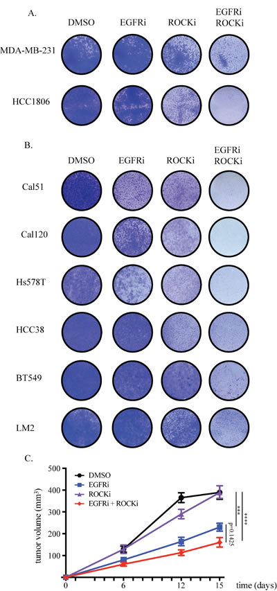 Figure 4: Combined EGFR and ROCK inhibition effectively blocks proliferation of TNBC cells. A. 0.1*105 cells were seeded onto 12-well plates. Drugs were added one day after seeding and refreshed at the third day. MDA-MB-231 cells were treated with 20μM Gefitinib (EGFRi), 4.8μM GSK269962A (ROCKi) or the combination. HCC1806 cells were treated with 8.4μM EGFRi, 2.4μM ROCKi or the combination. Same doses were used for the combination treatments. Cells were stained with crystal violet six days after treatment. B. EGFRi-ROCKi combination has enhanced toxicity also on other TNBC cell lines. EGFRi concentration for Cal51, Cal120, Hs578T, HCC38, BT549 and LM2 cells was 20μM. ROCKi concentration for Cal51 cells was 12μM, for Cal120 cells was 30μM, for Hs578T cells 1.2μM, for HCC38 cells 12μM, for BT549 cells 8μM, for LM2 cells 4.8μM. C. HCC1806 cells were orthotopically injected into the 4th mammary fat pad of NSG mice. Starting from one day after inoculation, mice were orally treated six times a week with DMSO-containing vehicle, 90mg/kg EGFRi, 10mg/kg ROCKi, or EGFRi+ROCKi. Tumors were measured twice weekly and the tumor volumes were calculated by the formula a*b2/2.