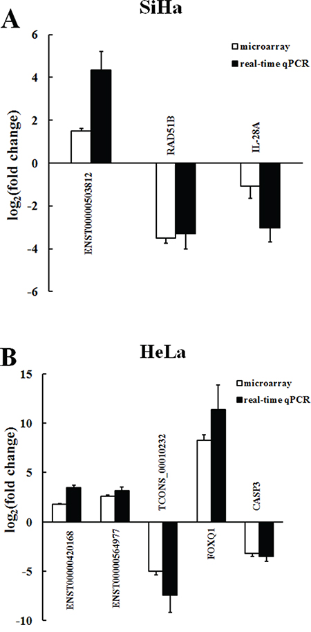 Figure 6: Comparison between microarray and real-time qPCR for differentially expressed lncRNAs and mRNAs in SiHa A. and HeLa B. The heights of the columns represent the log-transformed mean fold change in expression compared with C-33A. The bars represent standard errors. The real-time qPCR results were consistent with the microarray data (P<0.001).