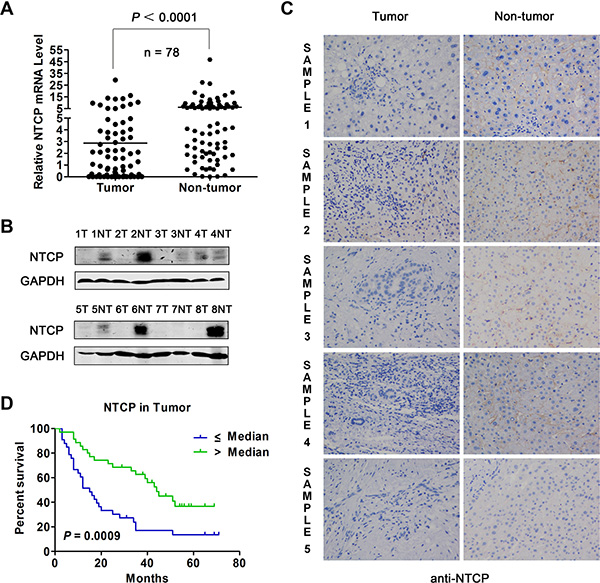 Figure 1: Expression of NTCP in HCC tumor tissues and its prognostic value for patient survival. (A) The level of NTCP mRNA in 78 pairs of HCC tumor tissues and adjacent non-tumor tissues was assayed by real-time RT-PCR. (B) The protein levels of NTCP in 8 pairs of HCC liver tissues was assayed by Western blot using anti-NTCP monoclonal antibody P17-39. T: tumorous tissue; NT: adjacent non-tumor tissue. (C) The IHC study of NTCP was conducted in five pairs of HCC tumor tissues and adjacent non-tumor tissues (200×) using anti-NTCP monoclonal antibody P17-39. Immunostaining for NTCP reveals a positive membranes pattern in the four adjacent non-tumor tissues, whereas less/non-expressions in the five tumor tissues. (D) Survival rates of HCC patients with different levels of NTCP in tumor tissues were analyzed by Kaplan-Meier curve analysis. The total number of analyzed patients is only 69 of the study cohort of 78, due to the lack of follow-up data in some patients.