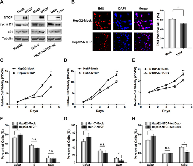 Figure 2: Ectopic NTCP expression suppresses proliferation in HCC derived cell lines. (A) Detection of NTCP expression levels in HCC derived cell lines by western blotting, and the protein levels of cyclin D1 and p21 were also analyzed. Flag tag antibody and NTCP monoclonal antibody were used to detect NTCP expression. (B–E) Cell proliferation analysis in cells either stably expressing ectopic NTCP or expressing it following Dox mediated induction in NTCP-tet cells. In panel B, the EdU Cell Proliferation Assay was conducted in HepG2 cells stably expression NTCP. In panel C, D and E, CCK-8 assays were used to detect cell proliferation. Data are shown as the mean ± standard deviation of 6 repeats in three independent experiments. (F–H) Flow cytometry analysis of the cell cycle was conducted in the cells either stably expressing NTCP or expressing it following Dox mediated induction in NTCP-tet cells. All experiments were repeated three times.