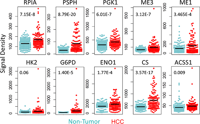 We further analyzed the expression levels of the above-identified 22 carbon metabolism genes in microarray Set-1 and -2 (detected by 52 probes in Affymetrix U133Plus2.0 array). In Set-1, 37% (19/52) of probes were found to have a more than 1.2 fold increase in signal densities in HCC (compared to non-tumor liver tissues); 52% (27/52) of probes were found to have almost the same level as in non-tumor liver tissues (HCC:non-tumor ratio 0.83~1.2); only 11% (6/52) of probes have a decreased level (HCC:non-tumor ratio < 0.83). In Set-2, the percentages of probes with signal densities increased, no change, or decreased are 56% (29/52), 38% (20/52), and 6% (3/52), respectively. Ten consistently up-regulated genes across different data sets were shown as representatives in Figure 3 (Set-1 data) and Supplementary Figure S3 (Set-2 Data).