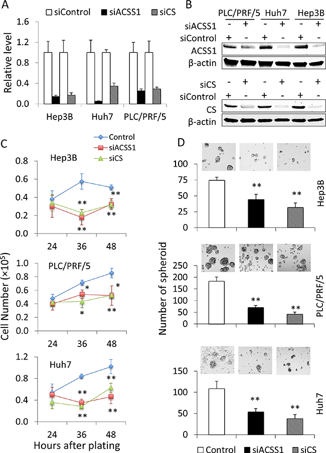 Figure 5: Knock-down of CS or ACSS1 is able to decrease the malignant characteristics of HCC cells. HCC cell lines Hep3B, PLC/PRF/5, and Huh7 were transfected with CS- or ACSS1-specific siRNA; 24 hours after transfection, the cells were assessed for knockdown efficacies. (A, B) knockdown efficacies as determined by quantitative RT-PCR (A) and Western blot (B). (C) Cell proliferation was measured at 24, 48, and 72 hours in indicated cells after plating 5 × 104 cells per well in 6-well plates. Knockdown of CS or ACSS1 significantly decreased cell proliferation. (D) cell spheroid formation assays were performed in CS or ACSS1 knockdown and control HCC cells. Single-cell suspensions were plated at a density of 5 × 103 cells per well in 24-well Ultra-Low Attachment Plates. The cells with CS or ACSS1 knockdown showed more than 50% reduction in the number of hepatospheroid compared with individual control cells after 7 day-culture in serum-free medium. The data are expressed as means ± SD. *P < 0.05, **P < 0.01 vs. corresponding control cells.