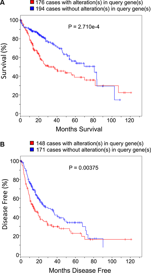 We next used publicly available data and tools from TCGA database to analyze whether the expression levels of the twenty-two carbon metabolism genes may influence HCC patients survival [21, 22]. Specifically, the 22 genes were used to query against the Liver Hepatocellular Carcinoma (TCGA, Provisional) data set, which includes both mRNA expression and survival information of 373 HCC patients as of the Eighteenth day of February 2016. Results of the analysis show that 47.2% (176/373) of HCC patients have gene expression altered in at least one of those 22 genes compared to the non-tumor liver tissues; 97.7% (375/384) of those alterations are up-regulated expression (Supplementary Figure S4). Of all the 176 patients in the TCGA provisional data set with altered expression of signature genes, the percentages of patients that have more than 2, 4, or 6 signature genes level increased are 47%, 20%, and 7.3% respectively. As combinations of increased genes vary among different patients, it is worth mentioning that the above-indicated systematic analysis between tumor and non-tumor tissues confers advantage over the traditional comparison of specific gene(s). Our analyses show that patients with one or more alterations of the 22 genes in their tumor tissues show shorter overall survival periods compared to patients without up-regulation of these genes (Figure 6A and Supplementary Table S5; median survival months: 30.58 vs. 80.68; Log-Rank Test P = 2.71 × 10−4). This trend is also observed in patients’ disease free survival prognosis (Figure 6B and Supplementary Table S6; median disease free months: 14.22 vs. 29.96; Log-Rank Test P = 0.00375).