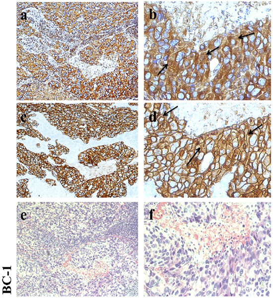 Figure 1: Immunohistochemical analysis of CD147 and HER2 expression in HER2-positive breast cancer. a, b. CD147 expression in breast cancer. c, d. HER2 expression in breast cancer. e, f. Hematoxylin-eosin (HE) staining. Left: 100× magnification; and right: 400× magnification.