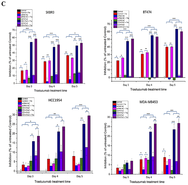 Then, time-dependent analysis was performed the four cell lines (Figure 4C). For each treatment time, the trends in cell proliferation were similar to those observed in dose-dependent analysis in the four cell lines. The only difference was that the inhibition rates in the CD147-knockdown groups were markedly increased compared with those in the control groups of BT474 and SKBR3 cells (p<0.001) and HCC1954 cells (p<0.05) following the 3-day treatment, whereas in MDA-MB453 cells, such enhancement was observed following the 4-day treatment (p<0.01). No significant differences in the inhibition rates were noted between the siRNA NC and control groups in the four cell lines.