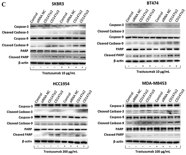 Furthermore, we detected the levels of apoptotic proteins in the four cell lines (Figure 5C). Consistent with the above results, cleaved Caspase-3/9 and cleaved PARP were increased only in the CD147-knockdown and CD147-knockdown-plus-trastuzumab treatment groups compared with the control groups, regardless of trastuzumab treatment. In particular, the levels of cleaved Caspase-3/9 were markedly altered in SKBR3 cells, in addition to the levels of cleaved Caspase-9 and PARP in BT474 and MDA-MB453 cells and those of cleaved Caspase-3 and PARP in HCC1954 cells. There were no significant differences in the levels of apoptotic proteins between the two control groups in the four cell lines.