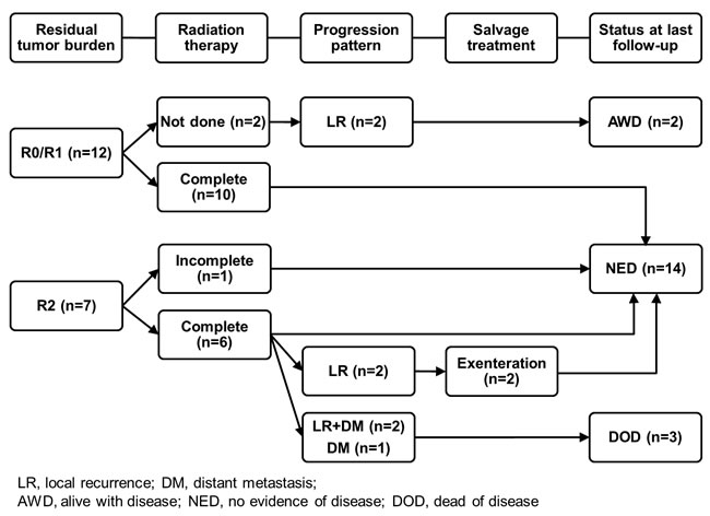Abbreviations: RT, radiation therapy; R0, complete resection with no microscopic residual tumor; R1, complete resection with no gross residual tumor but microscopic involvement of the resection margin on pathological report; R2, partial resection with gross residual tumor or radiographic evidence of gross residual tumor; LR, local recurrence; DM, distant metastasis; NED, no evidence of disease; AWD, alive with disease; DOD, dead of disease