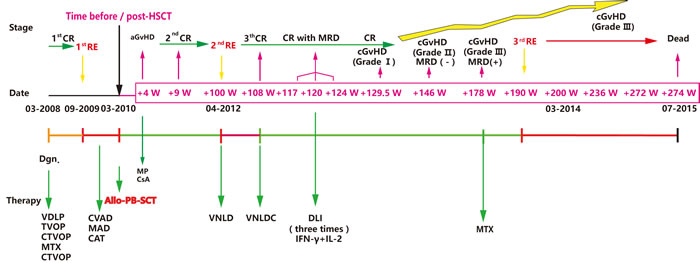 After being admitted in December 2009 with a recurrent T-ALL diagnosis, the patient received three courses of salvage chemotherapy lasting for three months (specific therapy protocols are shown in Figure 1); however, his response assessments were partial remission (PR), minor remission (MR), and MR respectively. Considering the poor prognosis for relapse T-ALL [2], the patient received an HLA-identical sibling peripheral blood (PB) HSCT on March 2010. Fifteen days after HSCT, a second complete remission was achieved (CR2). Short tandem repeat (STR) analysis revealed a 100% donor chimera. Four weeks after HSCT, the patient suffered grade IV skin acute GvHD (aGvHD), which was ultimately controlled with methylprednisolone (MP) and cyclosporin (CsA) treatment at eight weeks post-HSCT [4]. Central nervous system leukemia (CNSL) was found 20 weeks post-HSCT; thus, intrathecal chemotherapy and radiotherapy of the head were then applied [5]. The patient continued CR2 and remained normal upon cerebrospinal fluid examination at 40, 52, and 68 weeks post-HSCT. However, relapse (RE2) was detected again 100 weeks after HSCT, approximately 33.5% lymphoblasts revealed in bone marrow (BM). After receiving chemotherapy over the next two months, the patient achieved his third remission (CR3; 108 weeks post HSCT) with minimal residual disease (MRD) detected by flow cytometry (FCM).