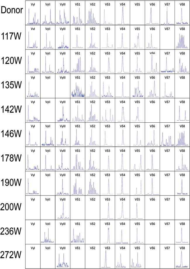 Figure 2: CDR3 spectratyping of the TCR Vγ and Vδ subfamily T cells in peripheral blood from the donor and recipient (117 to 272 weeks post-HSCT) at different time points after allo-HSCT. The 466bp Vδ5 clone was not detected in the donor sample and the recipient sample in 178 weeks post-HSCT, the same size Vδ4 monoclone could be detected in the donor and recipient samples in all time points post-HSCT. All the Vδ3, Vδ4 and Vδ5 clones detected in the same size are shown in the same position in horizontal axis. CDR3, complementarity determining region 3.