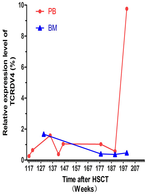 In this study, we continually monitored the TCR γδ repertoire in this patient from 117 weeks post-HSCT until the patient died at 274 weeks post-HSCT due the third relapse (RE3/the second relapse post-HSCT).